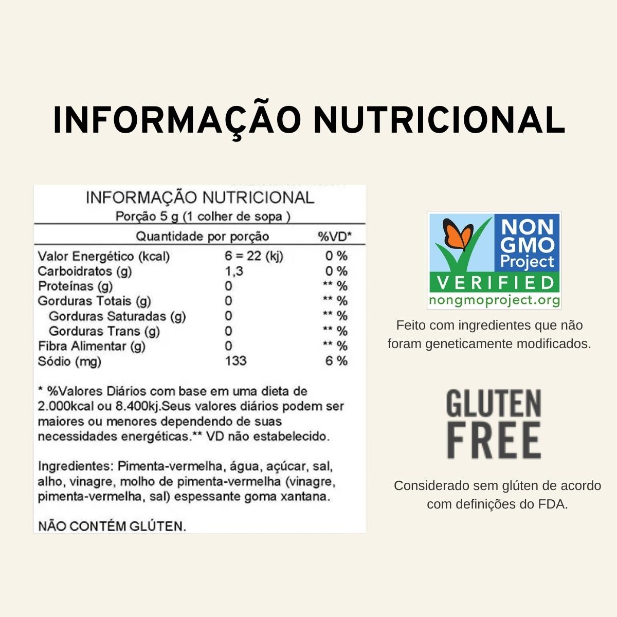 Ingredientes: pimenta Jalapeno vermelha, água, açúcar, sal, alho, vinagre, espessante goma xantana, molho de pimenta original da TABASCO® (vinagre, pimenta vermelha, sal). SEM CONSERVANTES. NÃO CONTÉM GLÚTEN.